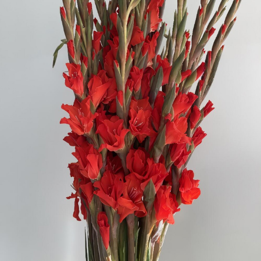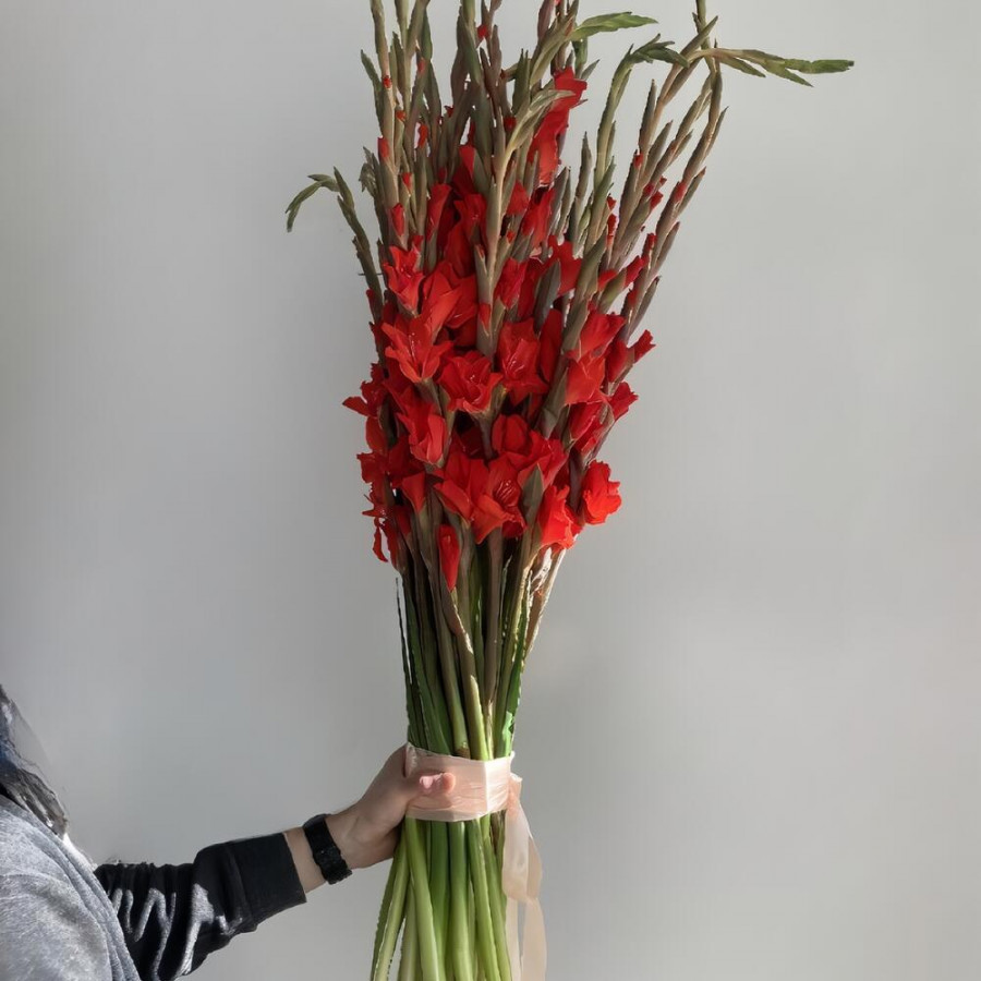 На фото букет из 29 красных гладиолусов. В составе: гладиолус 29 шт, атласная лента 1 шт, . Все цветы свежие и ароматные, букет красиво оформлен и отлично подходит для подарка. Доступна доставка цветов или самовывоз.
