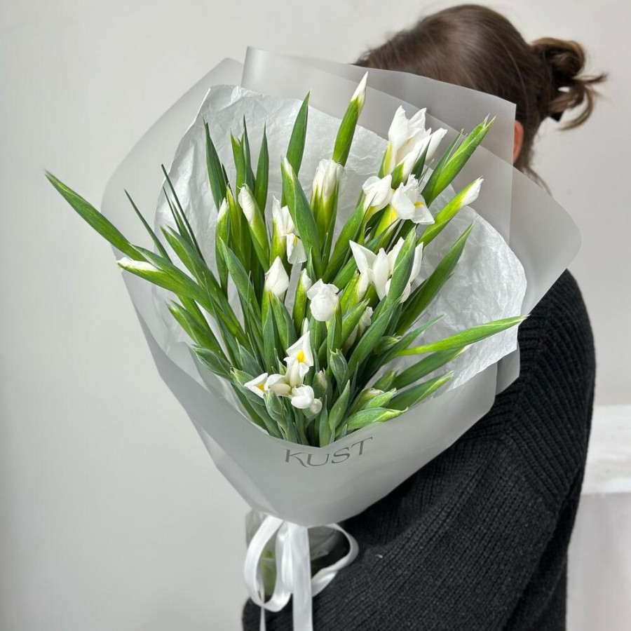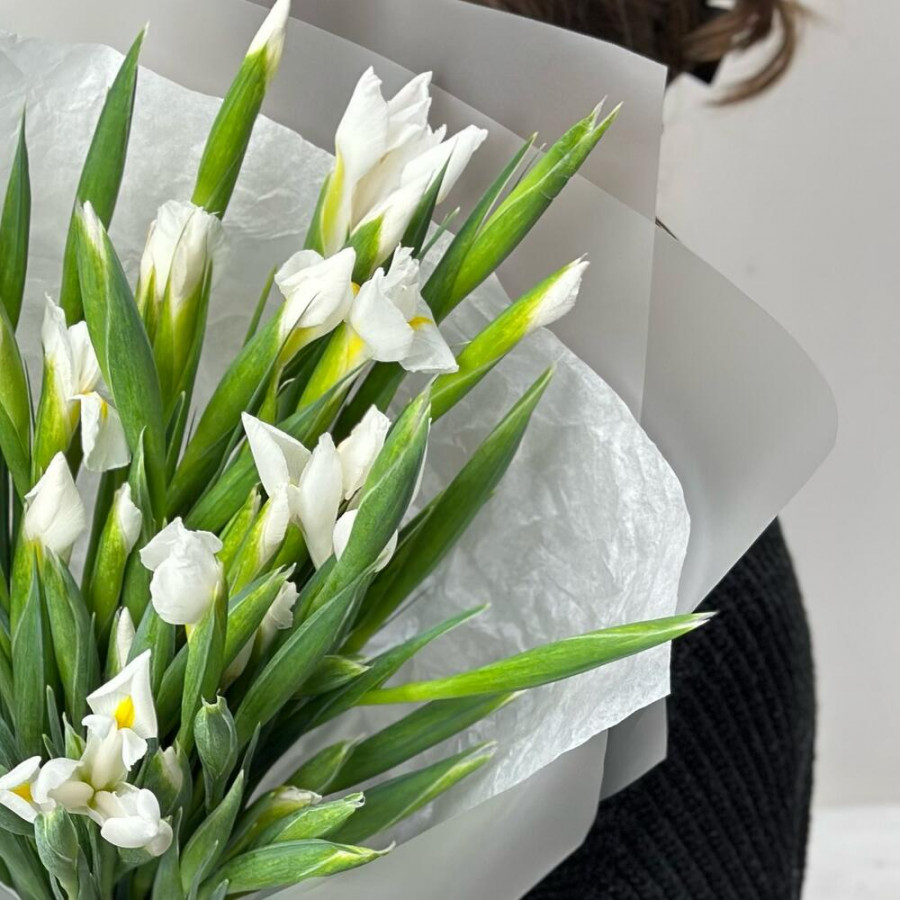 На фото нежный букет из 49 белых ирисов. В составе: ирис 49 шт, дизайнерская упаковка 2 шт, атласная лента 1 шт, . Все цветы свежие и ароматные, букет красиво оформлен и отлично подходит для подарка. Доступна доставка цветов или самовывоз.