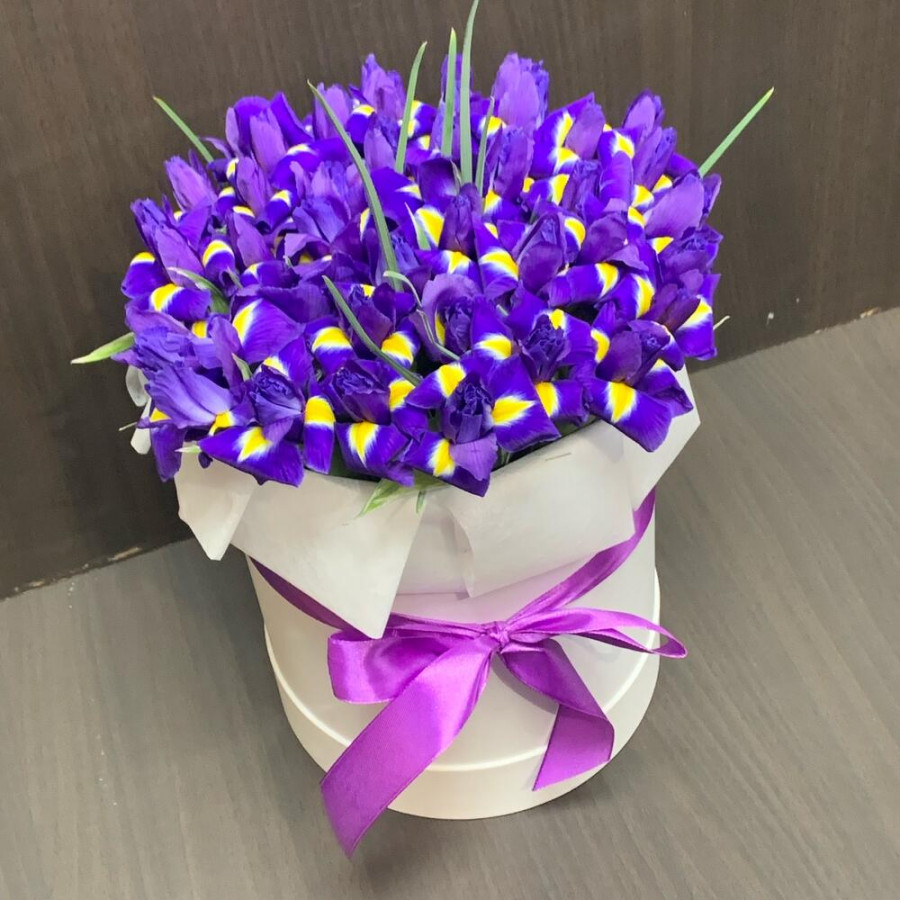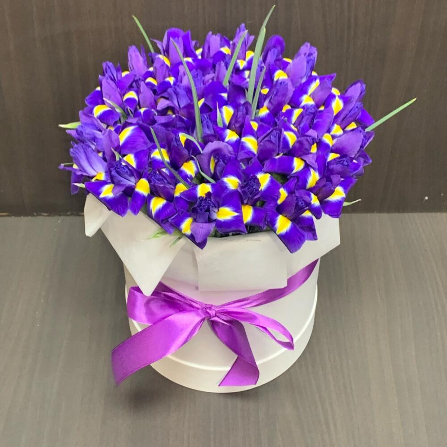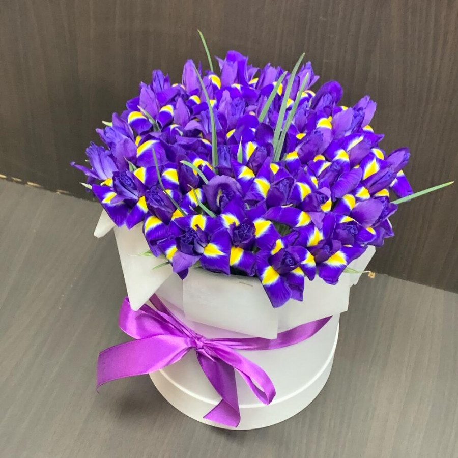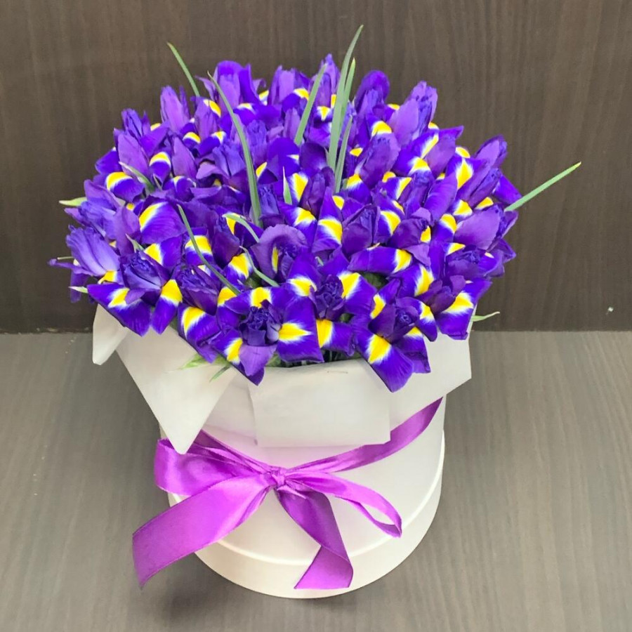 51 фиолетовый ирис в шляпной коробке в Саянске