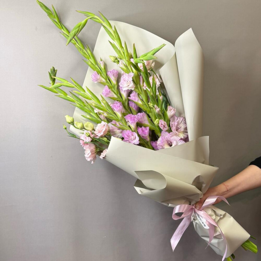 Эустома - 2 шт. Лента атласная - 2 шт. Гладиолус - 5 шт. Упаковка дизайнерская - 3 шт.