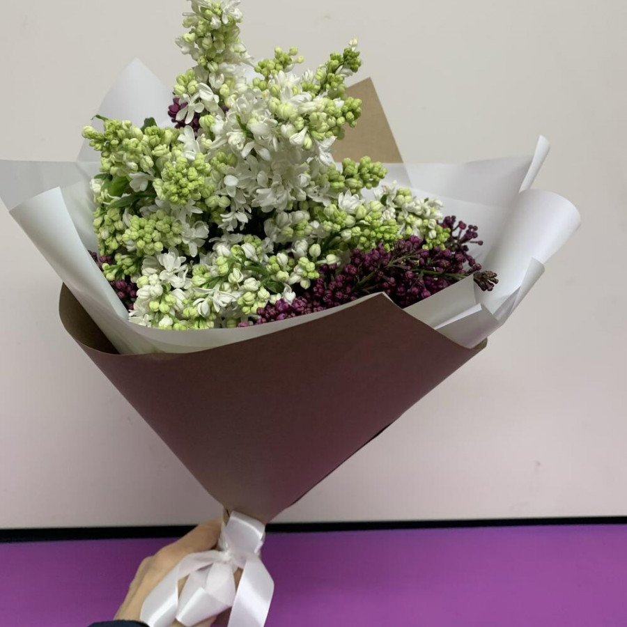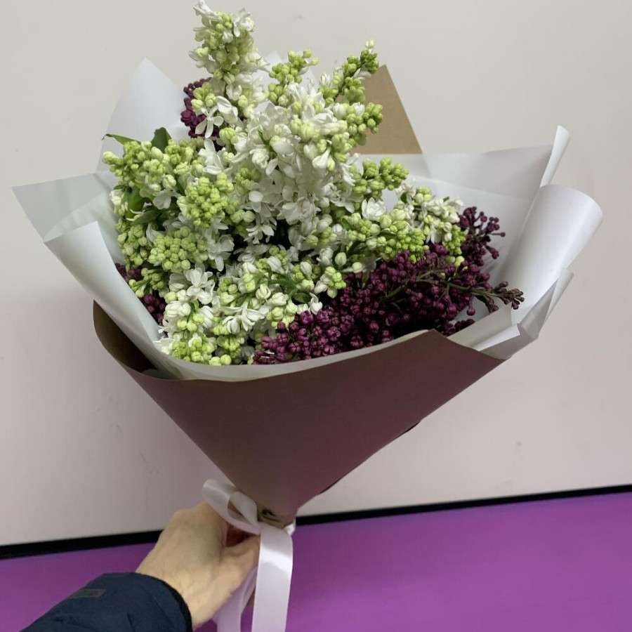 На фото букет из белой и фиолетовой сирени. В составе: сирень 9 шт, крафт-бумага 1 шт, атласная лента 1 шт, . Все цветы свежие и ароматные, букет красиво оформлен и отлично подходит для подарка. Доступна доставка цветов или самовывоз.