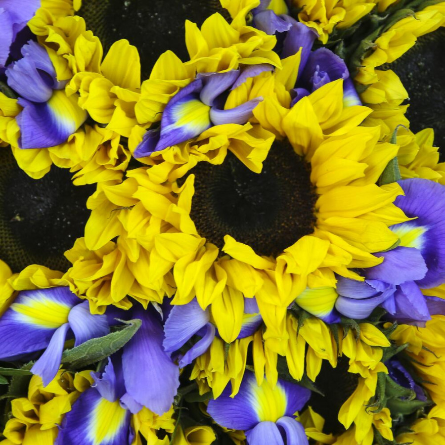 На фото букет из подсолнухов и ирисов. В составе: подсолнух 21 шт, ирис 8 шт, писташ 2 шт, дизайнерская упаковка 1 шт, атласная лента 1 шт, . Все цветы свежие и ароматные, букет красиво оформлен и отлично подходит для подарка. Доступна доставка цветов или самовывоз.