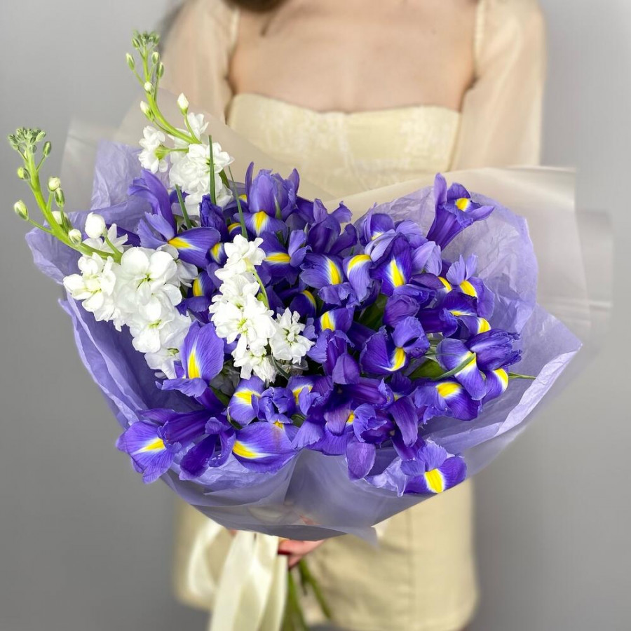На фото букет из синих ирисов и белой маттиолы. В составе: ирис 15 шт, маттиола 3 шт, дизайнерская упаковка 2 шт, атласная лента 1 шт, . Все цветы свежие и ароматные, букет красиво оформлен и отлично подходит для подарка. Доступна доставка цветов или самовывоз.
