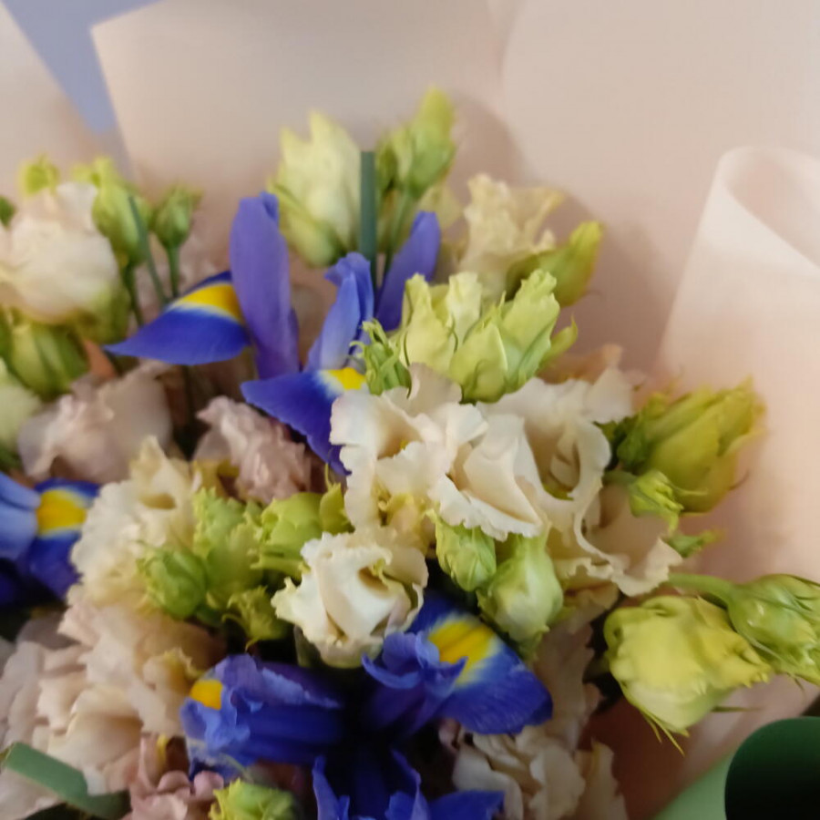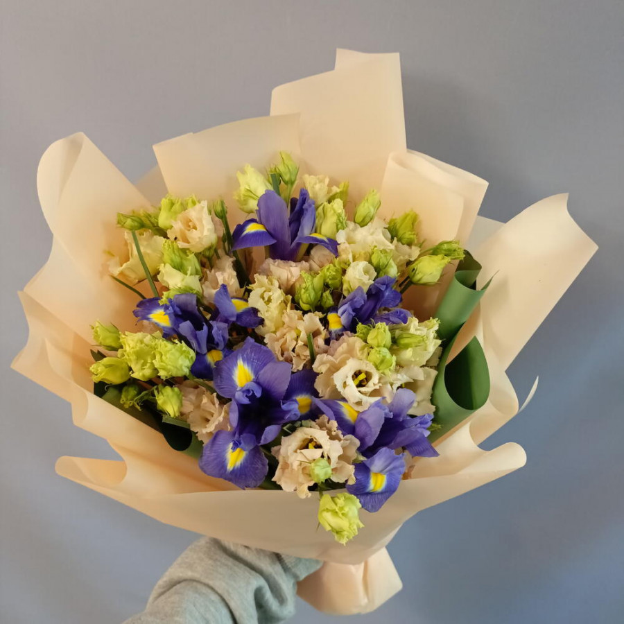 На фото букет из синих ирисов и кремовых эустом. В составе: ирис 5 шт, эустома (лизиантус) 4 шт, дизайнерская упаковка 1 шт, атласная лента 1 шт, . Все цветы свежие и ароматные, букет красиво оформлен и отлично подходит для подарка. Доступна доставка цветов или самовывоз.