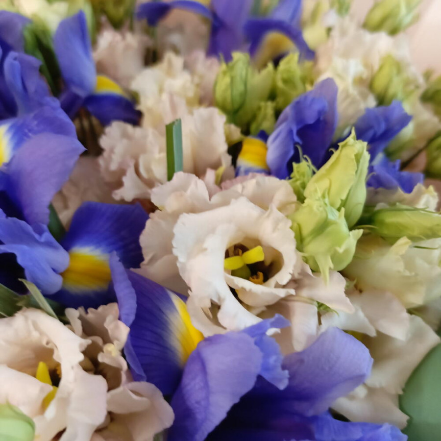 Букет из синих ирисов и кремовых эустом