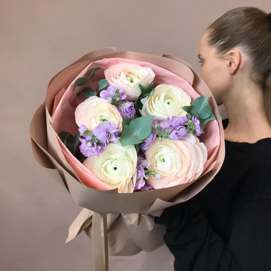 Букет из розовых ранункулюсов и сиреневой матиолы фото 4