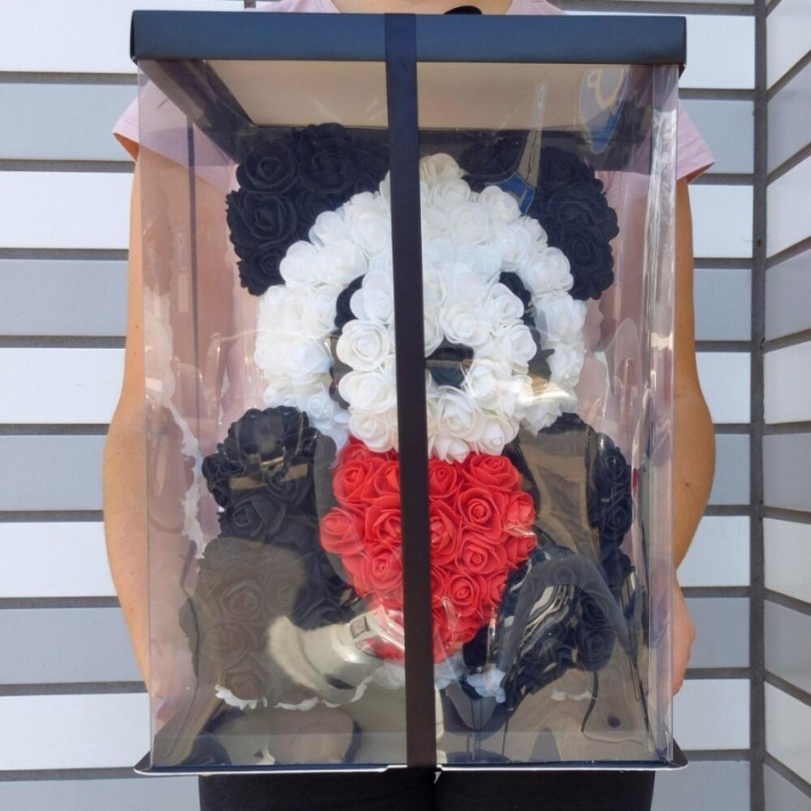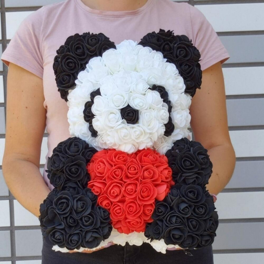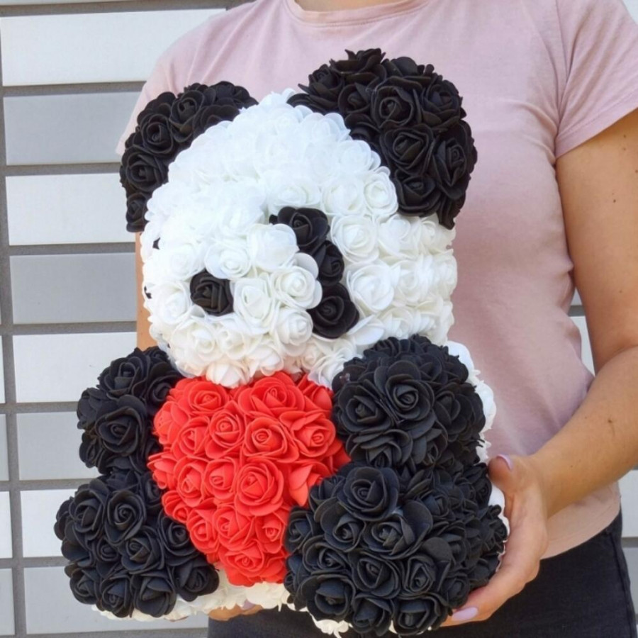 На фото мишка из роз «панда». В составе: . Все цветы свежие и ароматные, букет красиво оформлен и отлично подходит для подарка. Доступна доставка цветов или самовывоз.